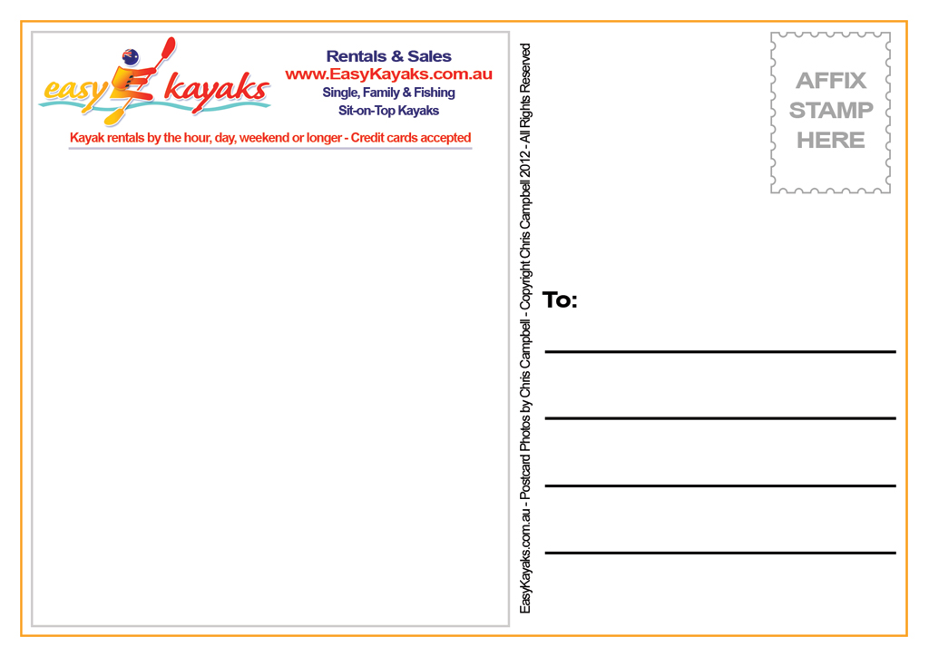 Easy Kayaks business cards and postcards have been ordered today. Postcards will be distributed to local souvenir shops, cafes, and kiosks so that visitors and locals alike can use them to send to family and friends.